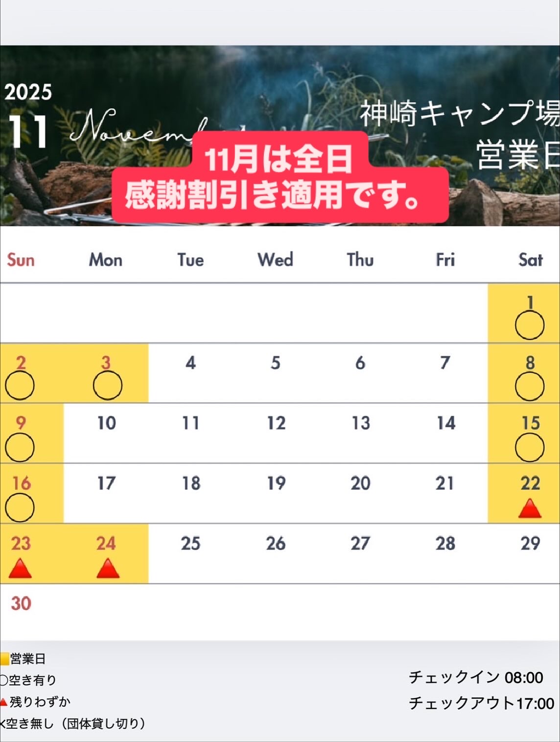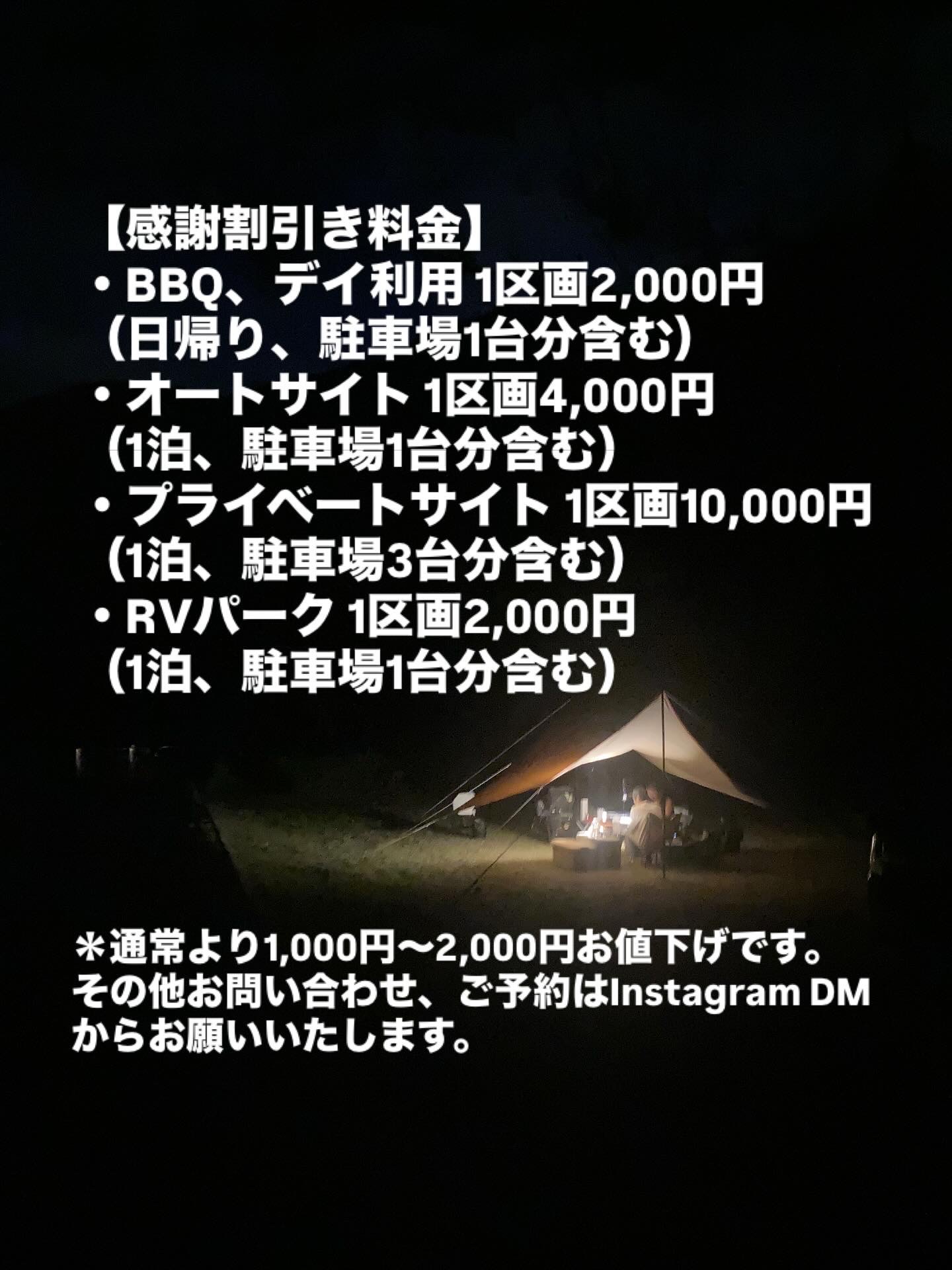 お知らせNEWS 【神崎キャンプ場「感謝割引き」について】 2025/10/31 お知らせ 神崎キャンプ場は皆様のたくさんのご来場により、ここまで運営することができました。そこで、感謝の気持ちを込めまして「感謝割引き」をさせていただきます。 テストオープンは11月末までとなっております。どうぞよろしくお願いいたします。 前の記事へ 一覧に戻る